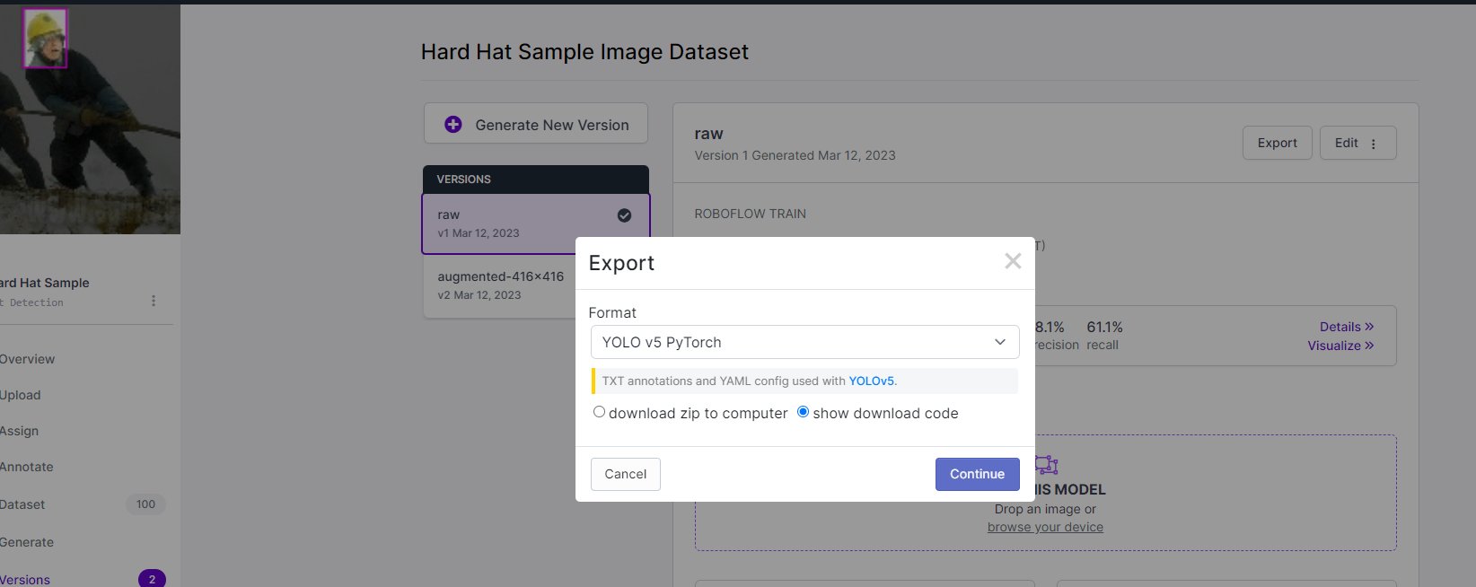 ์์ฑ์ ํ ๋ฐ์ดํฐ์ ์ Export ๋ฒํผ์ ๋๋ฌ ํฌ๋งท์ YOLO v5 PyTorch๋ก ์ง์ ํด์ผ ํ๋ค.