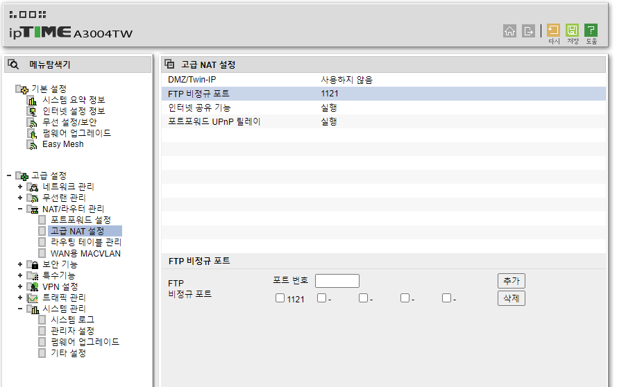 ipTIME ๊ณต์ ๊ธฐ์๋ ์ด์ ๊ฐ์ด ๋น์ ๊ท ํฌํธ๋ฅผ ์ฌ์ฉํ ๊ฒฝ์ฐ๋ฅผ ๋๋นํด์ NAT/๋ผ์ฐํฐ ๊ด๋ฆฌ - ๊ณ ๊ธ NAT ์ค์ ์ "FTP ๋น์ ๊ท ํฌํธ"๋ฅผ ๊ตฌ์ฑํด ๋์๋ค.