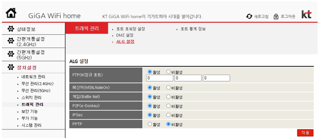 ๋ง์ฐฌ๊ฐ์ง๋ก KT GiGA WiFi home ๊ณต์ ๊ธฐ์๋ ์๋ ๊ธฐ๋ฅ์ด์๋ค. ์ฅ์น์ค์ - ํธ๋ํฝ ๊ด๋ฆฌ - ALG ์ค์ ์ผ๋ก ๊ฐ๋ฉด FTP ๋น์ ๊ท ํฌํธ ์ง์ ์ด ๊ฐ๋ฅํ๋ค.
