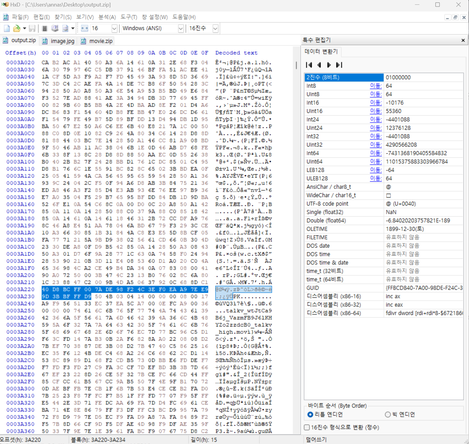 ๋ค์์ image.jpg์ output.zip์ ์์๊ณผ ์ค๊ฐ ์ชฝ์ ๋ฐ์ด๋๋ฆฌ๊ฐ ์ผ์นํ๋ ๊ฒ์ ํ์ธํ ์ ์๋ค.