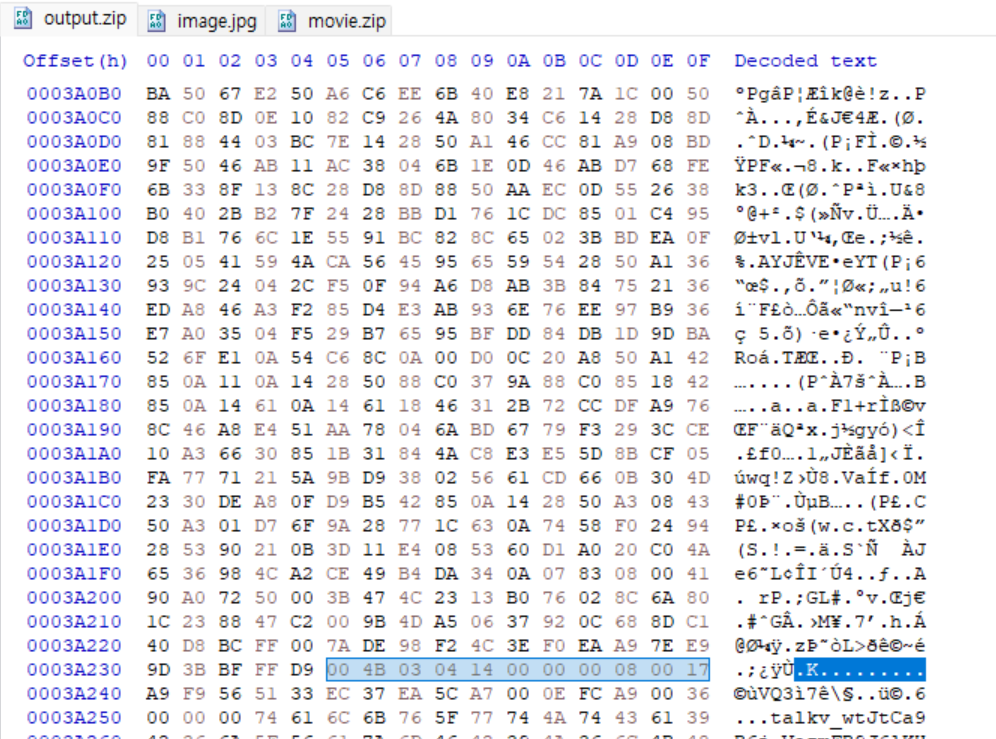 ๊ทธ๋ค์์ด ์ค์ํ ๋ถ๋ถ์ธ๋ฐ output.zip์ ์ด๋ฏธ์ง๊ฐ ๋๋๋ ๋ถ๋ถ ๋ค์์ ๋ฐ๋ก zip์ ์๊ทธ๋์ฒ๊ฐ ์จ๋ค. (50 4B 03 04 - PK)