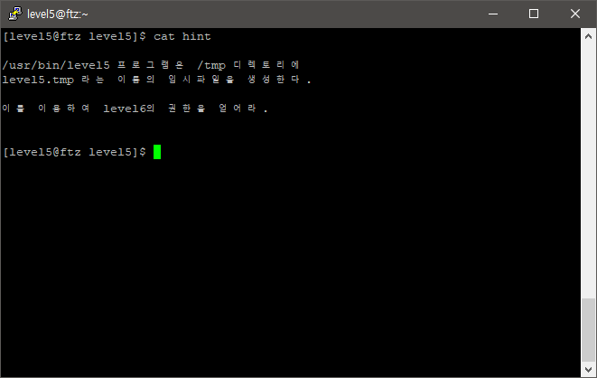 hint๋ /usr/bin/level5๋ผ๋ ํ๋ก๊ทธ๋จ์ /tmp ๋๋ ํ ๋ฆฌ์ level5.tmp๋ผ๋ ์ด๋ฆ์ ์์ ํ์ผ์ ์์ฑํ๋ค.