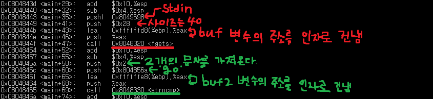 ํจ์์ ์ ๋ ฅ ๋ฐ๋ ์ธ์๋ค์ ํ์ธํ ์ ์๋ค. ์ฐ์ fgets์ 0x8049698(stdin ์ฃผ์)๋ฅผ ์คํ์๋ค ๋ฃ๊ณ , ๊ทธ๋ค์ ์ฌ์ด์ฆ 0x28(40)์ ์คํ์ ๋ฃ๊ณ buf ๋ณ์์ ์ฃผ์๋ก ๋ณด์ด๋ 0xffffffd8๋ ์คํ์ ๋ฃ๋ ๋ด์ฉ๋ค์ด ๋ณด์ธ๋ค.