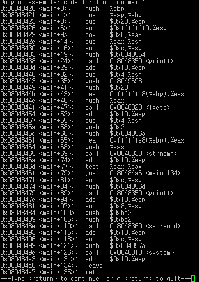 gdb์๋ ์ฌ์ฉ์ ์ ๋ ฅ์ ๊ธฐ๋ค๋ฆฌ๊ณ ์๋๋ฐ main ํจ์๋ฅผ ๋ณด๊ธฐ ์ํด์๋ "disas main"์ ์ ๋ ฅํ๋ค.