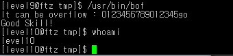 (/usr/bin/bof๋ level10 ์ธ์๋ ํ๋ก๊ทธ๋จ ๋ด๋ถ๋ฅผ ๋ค์ฌ๋ค๋ณผ ์ ์์ด์ ๋๋ฒ๊ฑฐ๋ก ์ด์ง ๋ชปํจ)