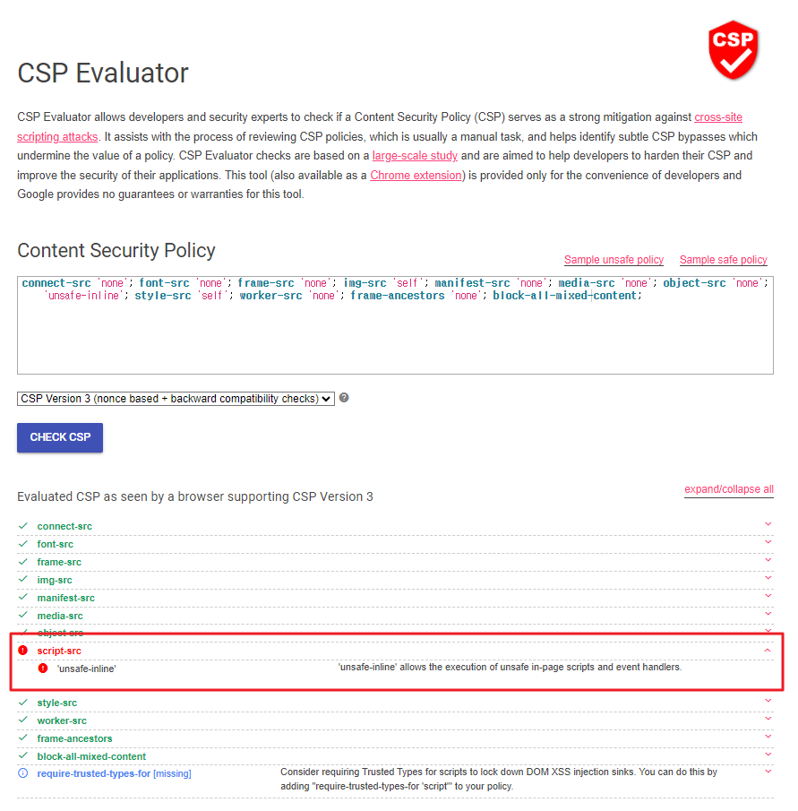 ํ์ผ๋ก https://csp-evaluator.withgoogle.com/์ ๋ค์ด๊ฐ๋ฉด csp๊ฐ ์ ๋๋ก ์ค์ ์ด ๋์ง ์์ ๊ณณ์ ํ๋์ ํ์ธ์ด ๊ฐ๋ฅํ๋ค.