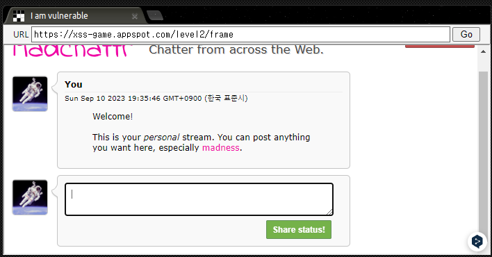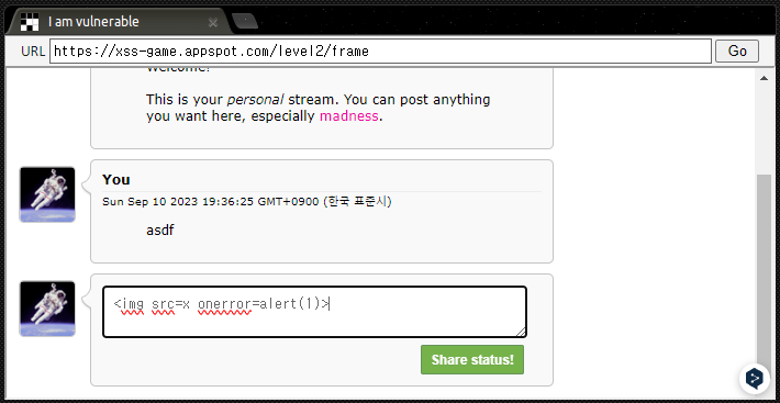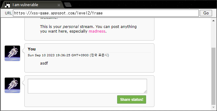 | XSS game - [6/6] Level 6: Follow the ๐ (0) | 2023.09.10 |