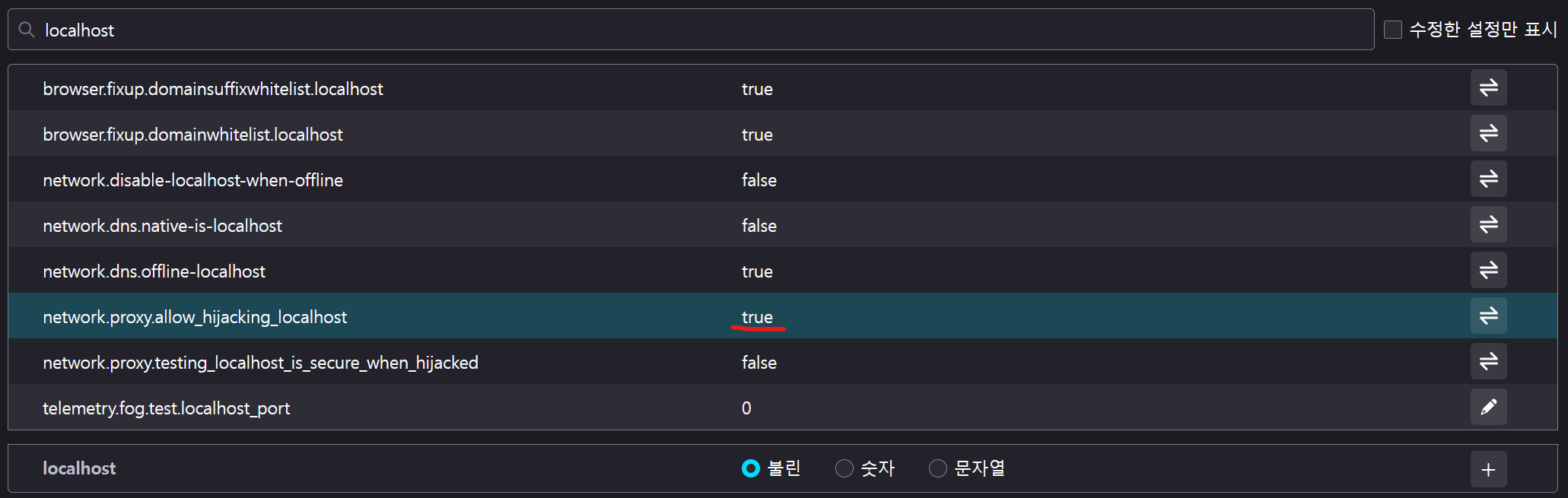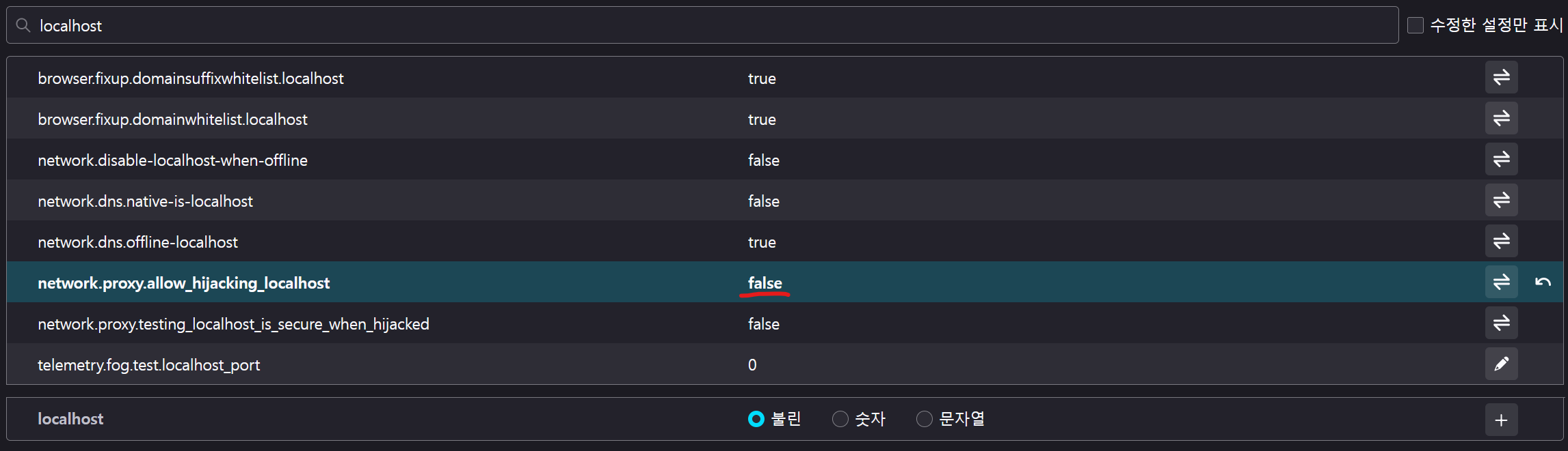 ๊ฒ์์ฐฝ์ "localhost"๋ฅผ ์ ๋ ฅํด ์๋์ network.proxy.allow_hijacking_localhost๋ฅผ false๋ก ๋ฐ๊ฟ์ค๋ค.